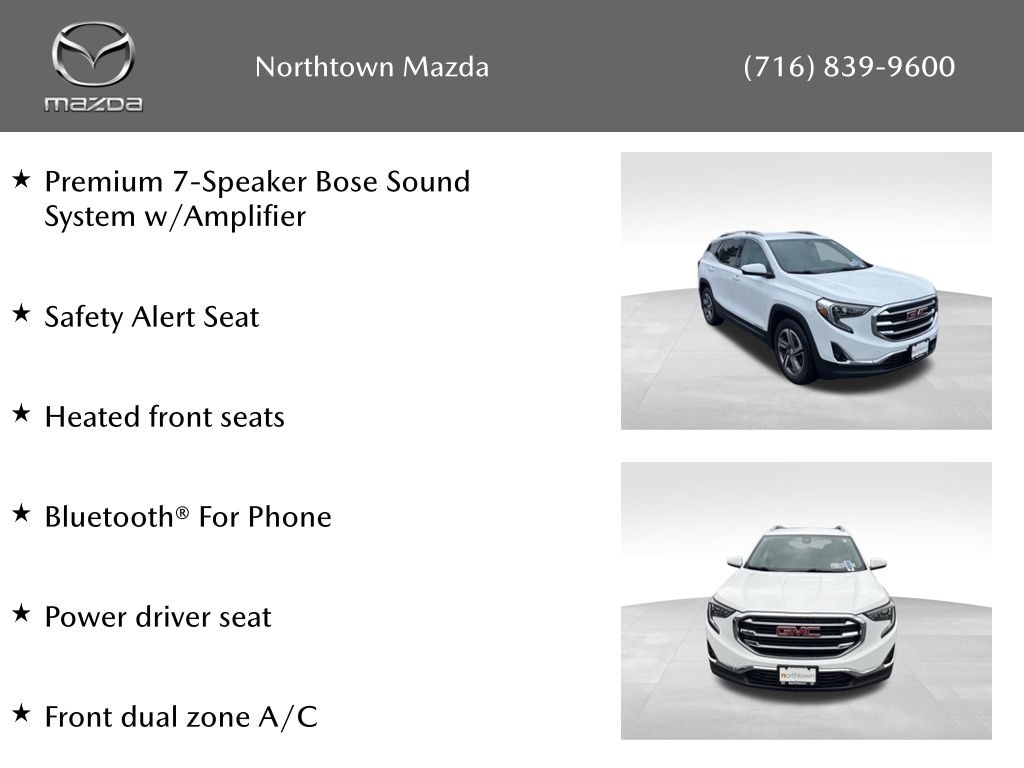 See the rest of our inventory at: NORTHTOWN MAZDA.COM Driver Alert Package I (Adaptive Cruise Control - Camera, Lane Change Alert w/Side Blind Zone Alert, Rear Cross-Traffic Alert, Rear Park Assist, and Safety Alert Seat), Memory Package, Infotainment Package II (Premium 7-Speaker Bose Sound System w/Amplifier, HD Radio, and Radio: GMC Infotainment Audio System w/Navigation), Interior Protection Package (LPO) (All-Weather Cargo Mat (LPO) and All-Weather Floor Mats), License Plate Front Mounting Package, Preferred Equipment Group 4SA, Preferred Package (Heated Steering Wheel, 6-Way Power Front Passenger Seat, Front Passenger 2-Way Power Lumbar, Hands-Free Rear Power Programmable Liftgate, and Universal Home Remote), Apple CarPlay/Android Auto, Bluetooth® For Phone, Exterior Parking Camera Rear, Front dual zone A/C, Heated door mirrors, Heated front seats, Lane Departure Warning System, Power driver seat, 2 USB Data Ports, 2 USB Data Ports w/SD Card Reader, 3.47 Axle Ratio, 4-Way Manual Front Passenger Seat, 4-Wheel Disc Brakes, 6 Speakers, 6-Speaker Audio System Feature, 8-Way Power Driver Seat Adjuster, ABS brakes, Air Conditioning, Alloy wheels, AM/FM radio: SiriusXM, Auto High-beam Headlights, Auto-dimming door mirrors, Auto-dimming Rear-View mirror, Automatic temperature control, Brake assist, Bumpers: body-color, Compass, Delay-off headlights, Driver & Front Passenger Heated Seats, Driver door bin, Driver vanity mirror, Dual front impact airbags, Dual front side impact airbags, Electronic Stability Control, Emergency communication system: OnStar and GMC connected services capable, Four wheel independent suspension, Front & Rear Molded Splash Guards, Front anti-roll bar, Front Bucket Seats, Front Center Armrest, Front fog lights, Front reading lights, Fully automatic headlights, High-Intensity Discharge Headlights, Illuminated entry, Low tire pressure warning, Occupant sensing airbag, Outside temperature display, Overhead airbag, Overhead console, Panic alarm, Passenger door bin, Passenger vanity mirror, Perforated Leather-Appointed Seat Trim, Power door mirrors, Power Driver Lumbar Control, Power steering, Power windows, Radio data system, Radio: GMC Infotainment Audio System w/8" Display, Rear anti-roll bar, Rear seat center armrest, Rear window defroster, Rear window wiper, Remote keyless entry, Roof rack: rails only, Security system, SiriusXM Radio, Speed control, Speed-sensing steering, Split folding rear seat, Spoiler, Steering wheel mounted audio controls, Tachometer, Telescoping steering wheel, Tilt steering wheel, Traction control, Trip computer, Turn signal indicator mirrors, Variably intermittent wipers, and Wheels: 18" x 7" Machined Aluminum w/Gray Accents.