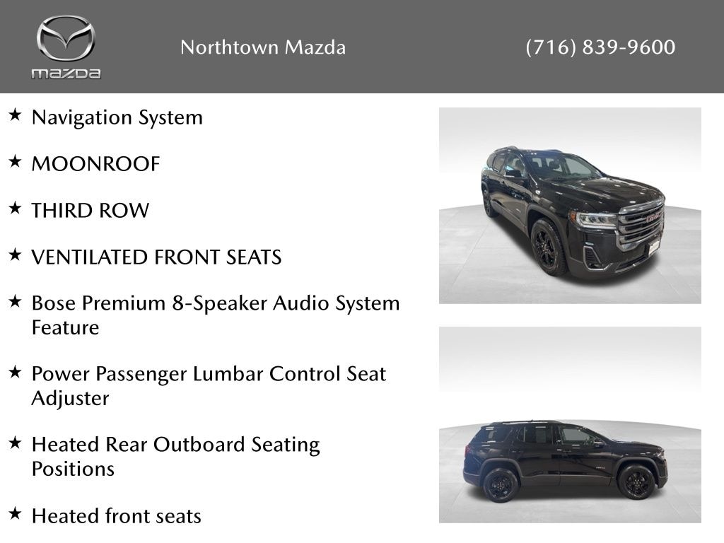 See the rest of our inventory at: NORTHTOWN MAZDA.COM Luxury Package (8-Way Power Passenger Seat Adjuster, Heated Rear Outboard Seating Positions, Power Passenger Lumbar Control Seat Adjuster, Power Tilt & Telescopic Steering Column, Power-Adjustable Body-Color Outside Heated Mirrors, and Heated & Ventilated Driver & Front Passenger Seats), Memory Package, Preferred Equipment Group 4SB, Preferred Package (Heated Steering Wheel), Technology Package (8" Multi-Color Enhanced Dr Instrument Info Display, Heads-Up Display, and HD Surround Vision), Apple CarPlay/Android Auto, Bose Premium 8-Speaker Audio System Feature, Electronic Stability Control, Front dual zone A/C, Heated door mirrors, Heated front seats, Knee airbag, Navigation System, Power driver seat, Power Liftgate, 3.49 Final Drive Axle Ratio, 3rd row seats: split-bench, 4-Way Manual Passenger Seat Adjuster, 4-Wheel Disc Brakes, 6-Passenger (2-2-2 Seating Configuration), 8 Speakers, 8-Way Power Driver Seat Adjuster, ABS brakes, Air Conditioning, Alloy wheels, AM/FM radio: SiriusXM with 360L, Auto High-beam Headlights, Auto-dimming Rear-View mirror, Automatic temperature control, Brake assist, Bumpers: body-color, Compass, Delay-off headlights, Driver door bin, Driver vanity mirror, Dual front impact airbags, Dual front side impact airbags, Dual SkyScape 2-Panel Power Sunroof, Emergency communication system: OnStar and GMC connected services capable, Four wheel independent suspension, Front anti-roll bar, Front Bucket Seats, Front Center Armrest, Front fog lights, Front License Plate Bracket, Front reading lights, Fully automatic headlights, Garage door transmitter, Heated Driver & Front Passenger Seats, Illuminated entry, Low tire pressure warning, Occupant sensing airbag, Outside temperature display, Overhead airbag, Overhead console, Panic alarm, Passenger door bin, Passenger vanity mirror, Power door mirrors, Power Driver Lumbar Control Seat Adjuster, Power steering, Power windows, Premium Cloth Seat Trim, Radio data system, Radio: AM/FM 8" Diagonal Multi-Touch Navigation, Rear air conditioning, Rear anti-roll bar, Rear reading lights, Rear window defroster, Rear window wiper, Remote keyless entry, Roof rack: rails only, Security system, SiriusXM w/360L, Speed control, Speed-sensing steering, Spoiler, Steering wheel mounted audio controls, Tachometer, Telescoping steering wheel, Tilt steering wheel, Traction control, Trip computer, Turn signal indicator mirrors, Variably intermittent wipers, Voltmeter, Wheels: 17" Gloss Black Aluminum, and Wireless Apple CarPlay/Wireless Android Auto.