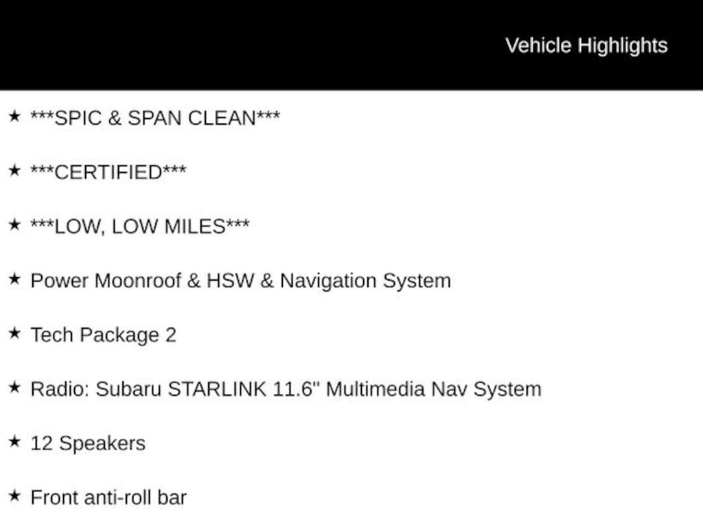 - Radio: Subaru STARLINK 11.6" Multimedia Nav System